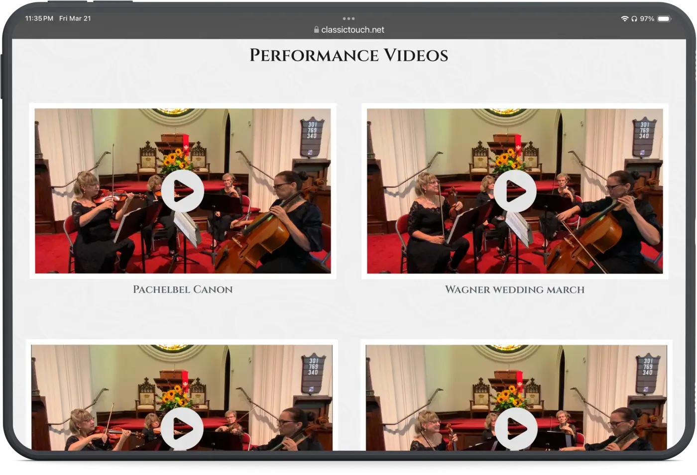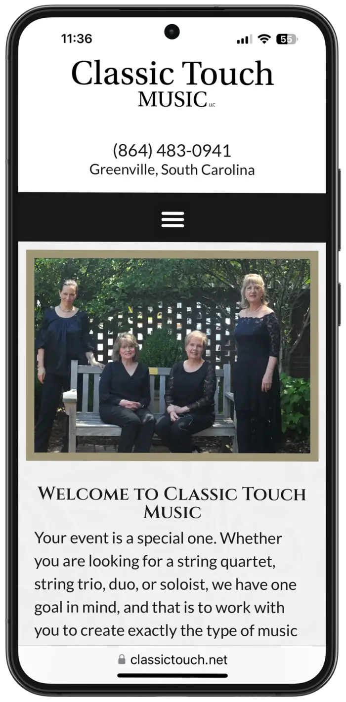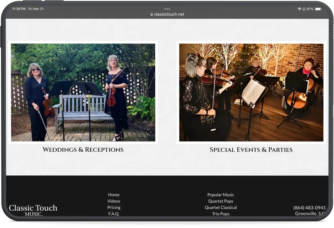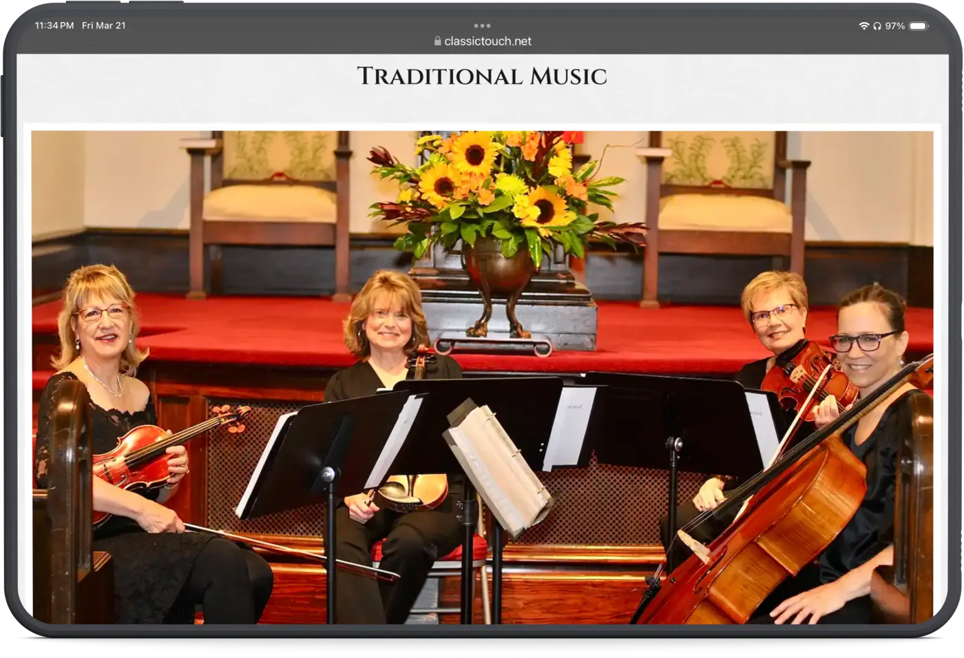 The new website for Classic Touch Music looks great on smartphones and tablets, making it easy for brides and event planners to browse on the go. Whether they’re searching for a string quartet, trio, or soloist, the clean layout and mobile-friendly design help them quickly find what they need. Services, music samples, and contact information are all just a tap away, ensuring a smooth and stress-free experience—perfect for planning a special day anytime, anywhere.