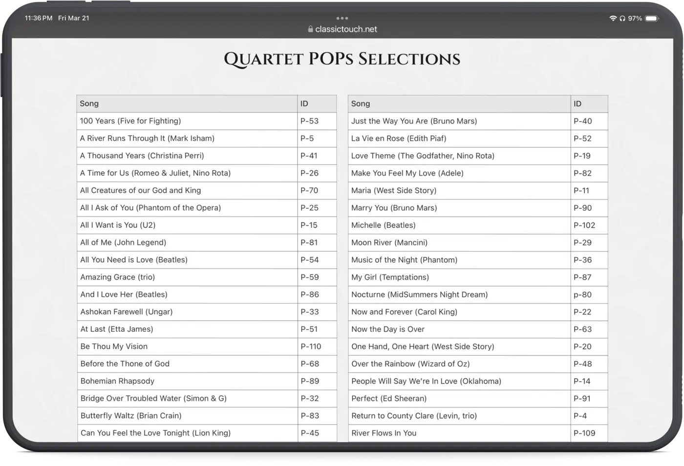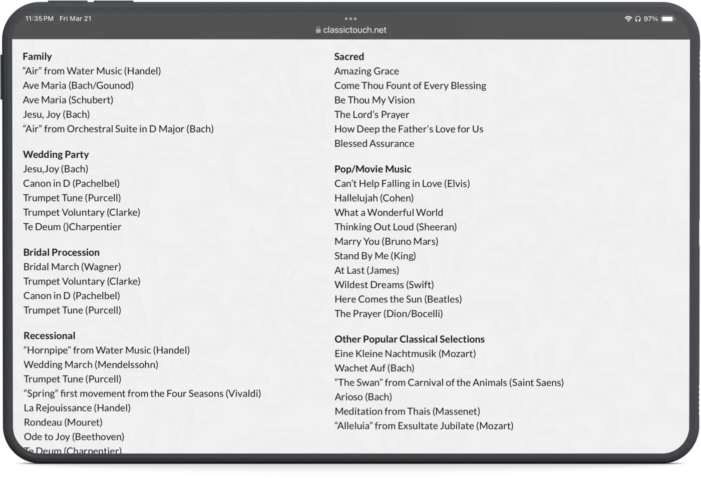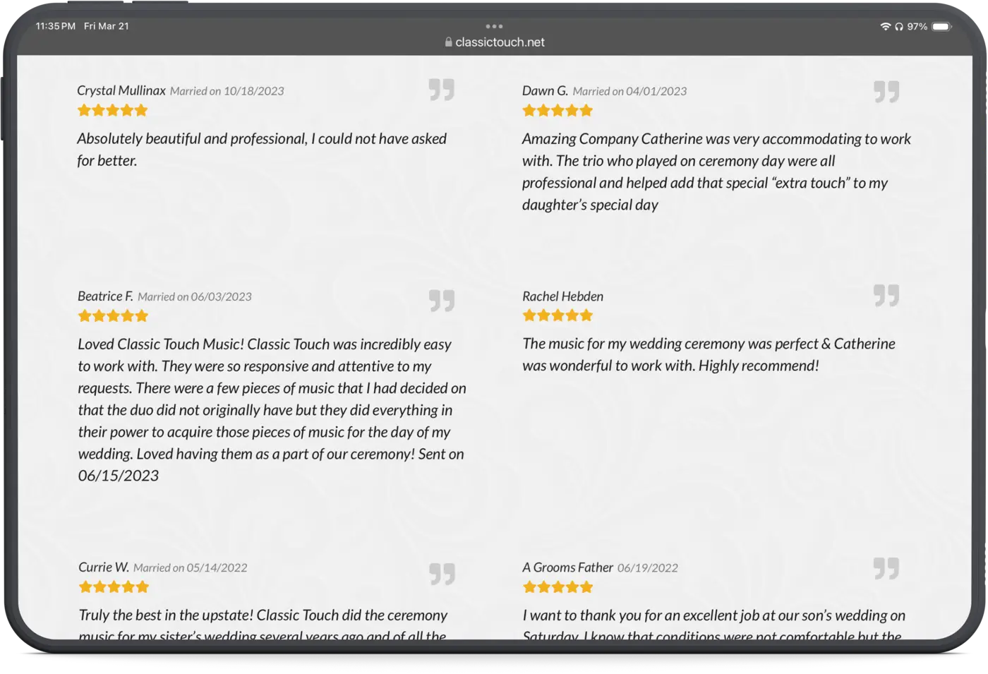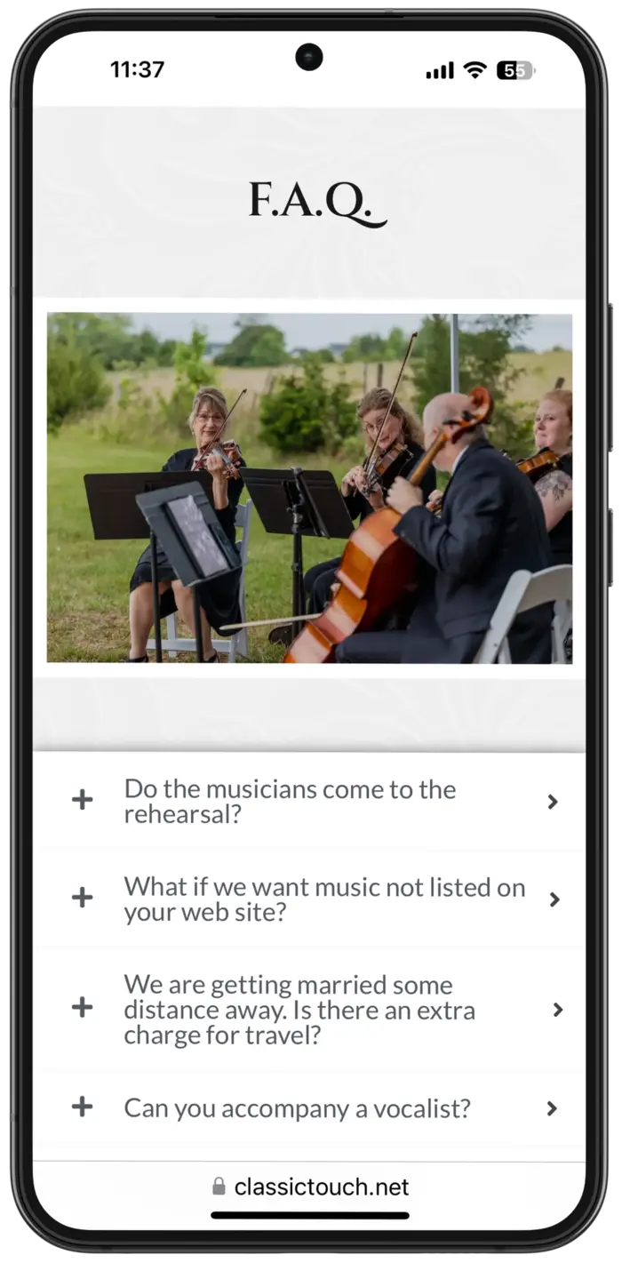 The new website for Classic Touch Music looks great on smartphones and tablets, making it easy for brides and event planners to browse on the go. Whether they’re searching for a string quartet, trio, or soloist, the clean layout and mobile-friendly design help them quickly find what they need. Services, music samples, and contact information are all just a tap away, ensuring a smooth and stress-free experience—perfect for planning a special day anytime, anywhere.