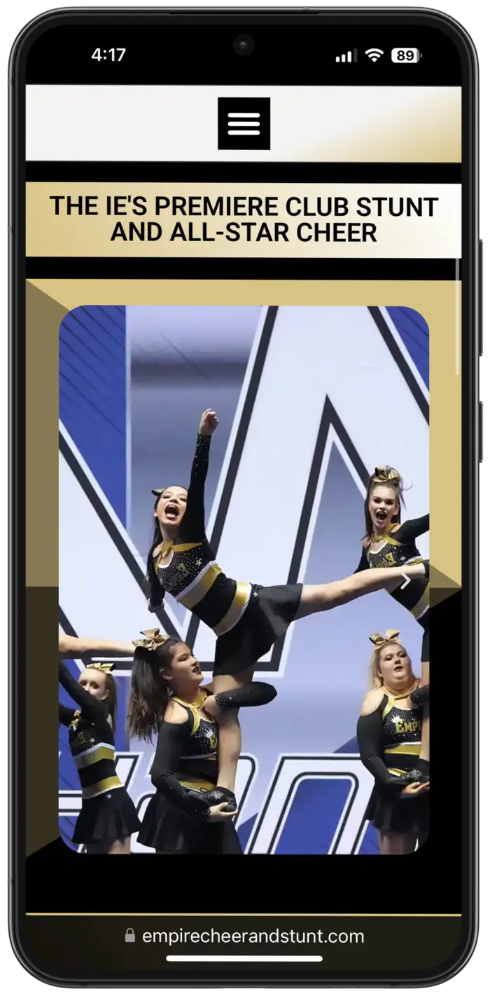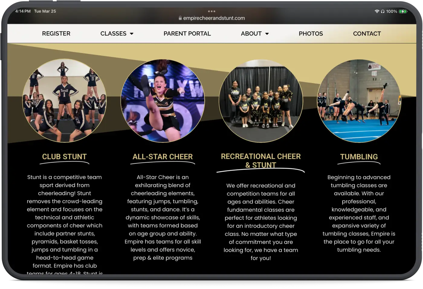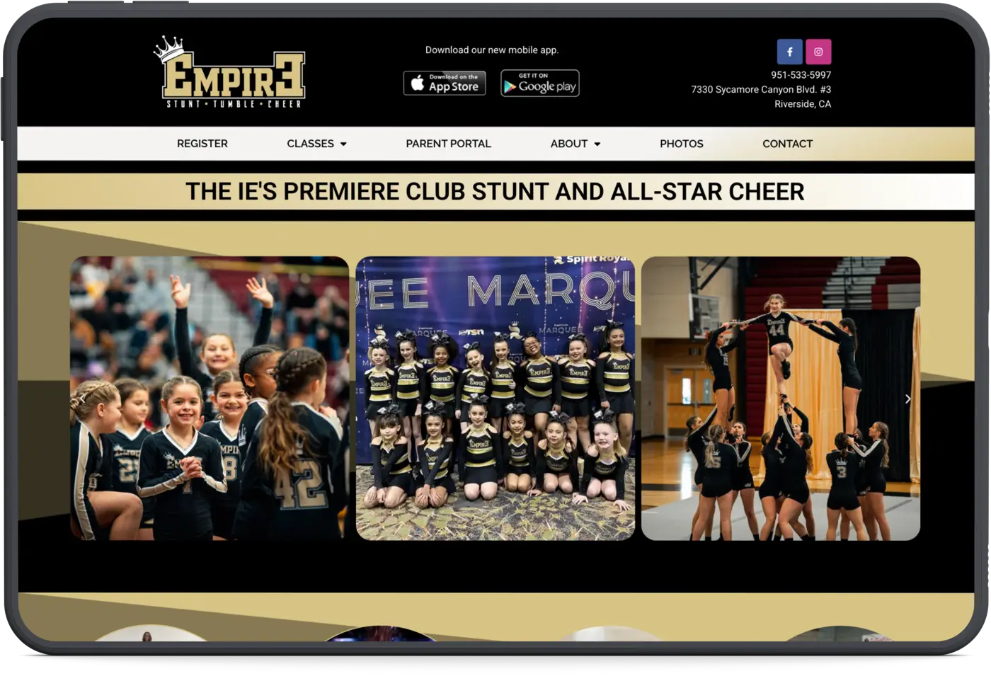 Responsive web design means the Empire Cheer and Stunt website looks amazing and works smoothly on any device—whether you’re on your phone, tablet, or computer. You can easily check team info, view class schedules, browse photos and videos, or stay updated on upcoming events from anywhere. The site automatically adjusts to fit your screen, so no pinching or zooming needed. It’s clean, modern, and easy to use—making it simple for athletes, parents, and fans to stay connected and in the loop. Whether you’re just starting out or going competitive, Empire makes it easy to find your place and be part of something great.