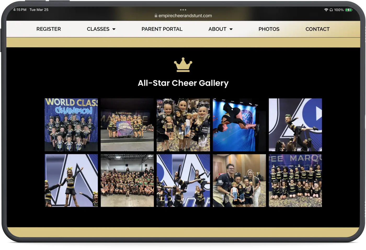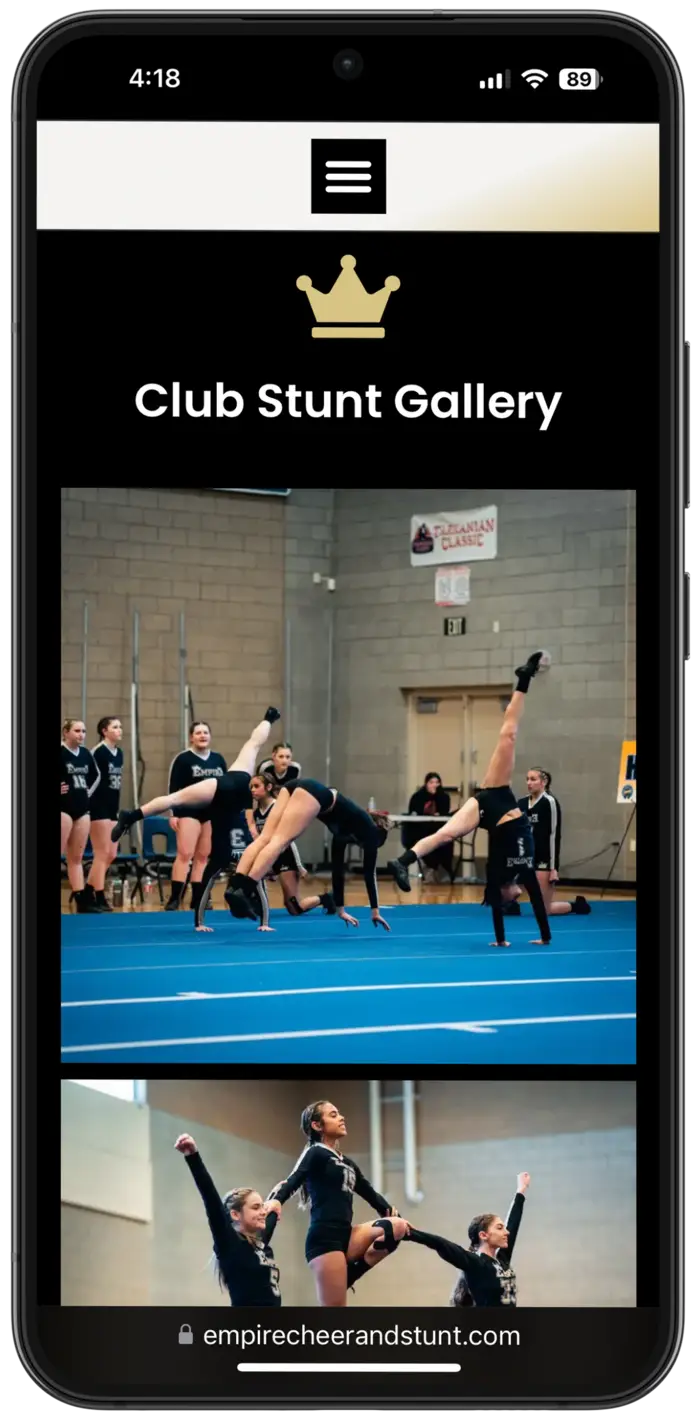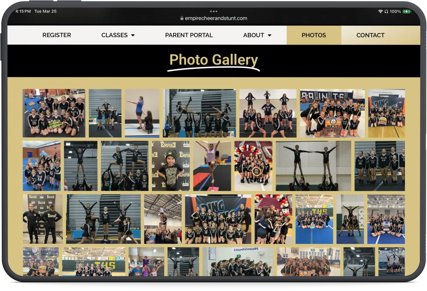 Responsive web design means the Empire Cheer and Stunt website looks amazing and works smoothly on any device—whether you’re on your phone, tablet, or computer. You can easily check team info, view class schedules, browse photos and videos, or stay updated on upcoming events from anywhere. The site automatically adjusts to fit your screen, so no pinching or zooming needed. It’s clean, modern, and easy to use—making it simple for athletes, parents, and fans to stay connected and in the loop. Whether you’re just starting out or going competitive, Empire makes it easy to find your place and be part of something great.