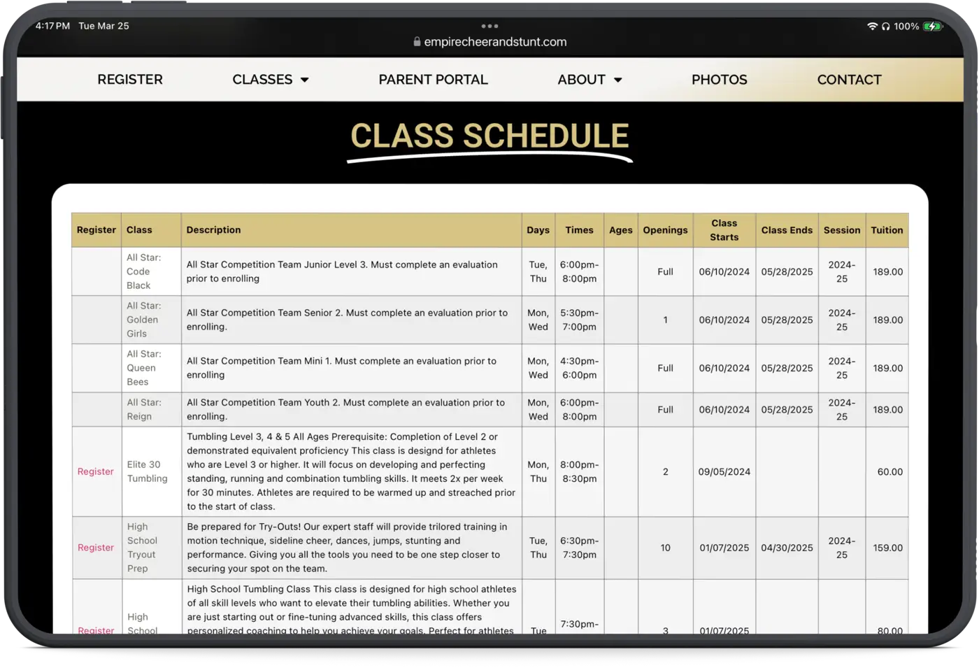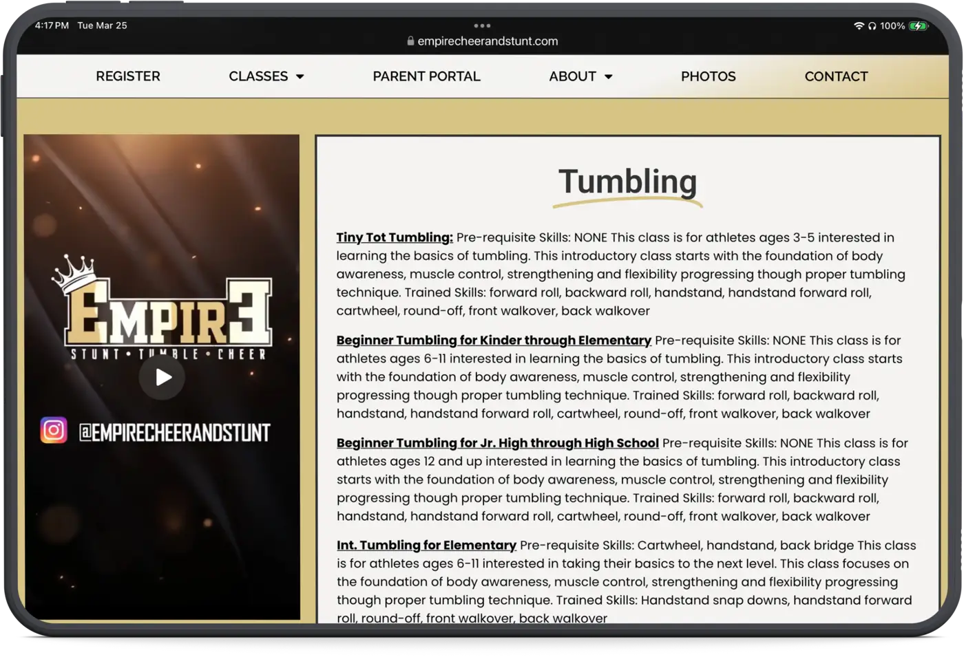 Parents can easily view class schedules and access the parent portal, all thanks to a smooth integration with Jackrabbit. The site is also designed to be easy to find on Google, helping more families discover what Empire has to offer.